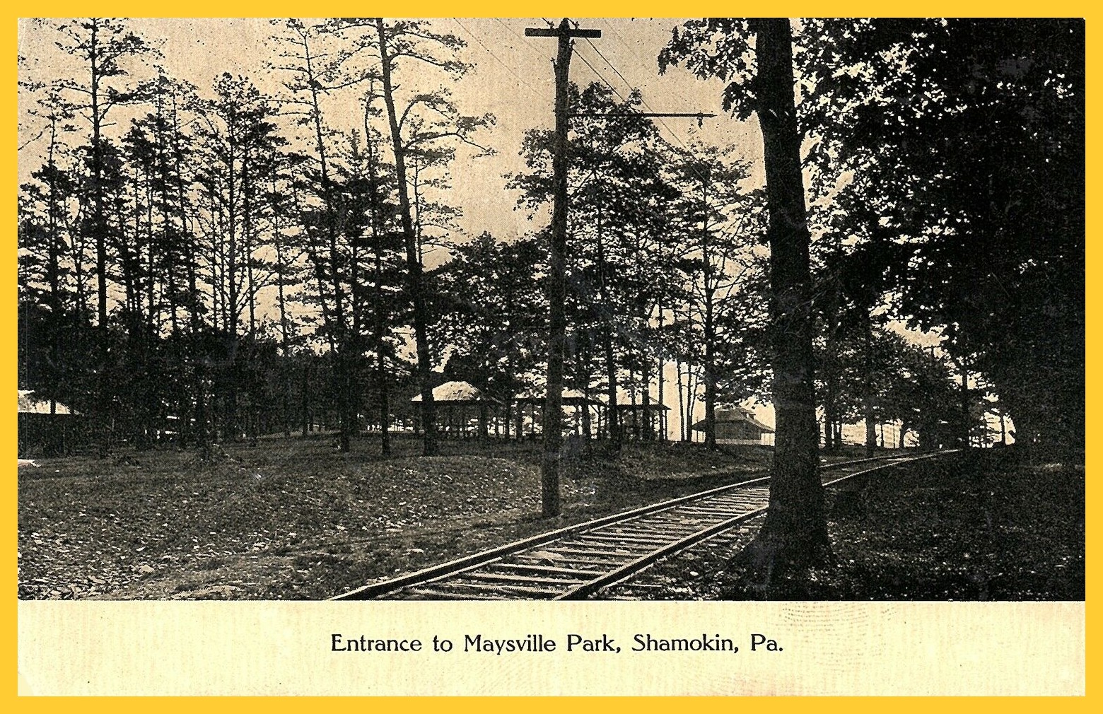 An undated colorized post card view of the entrance to Maysville Park, Shamokin, Northumberland County, Pennsylvania. Note the tracks providing access to the park.