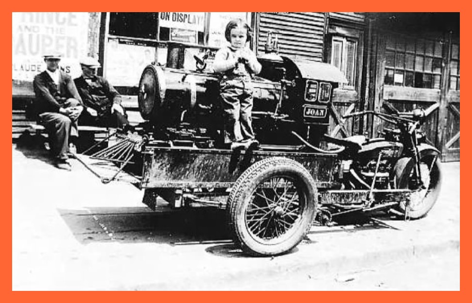 Bottom Photo: Joan Kelley, Coal Township, stands on a tri-cycle at her grandfather’s Indian Motorcycle Shop, First and Water Streets, Shamokin. The cycle contains a miniature train engine like the ones operated by Joan’s father and grandfather at Edgewood Park. In the background sitting on the bench are Russell Milbrand and grandfather, Oliver Milbrand, who was an engineer for the Reading Railroad.