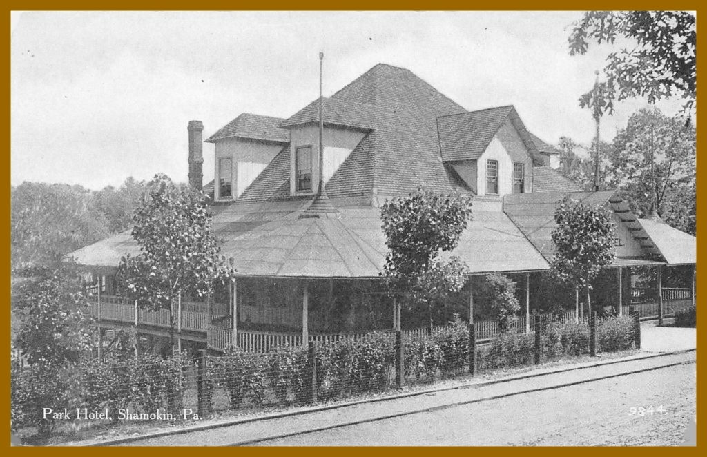 An undated photo post card view of the Park Hotel, Shamokin, Northumberland County, Pennsylvania, with Interurban (trolley) tracks running in front of hotel.