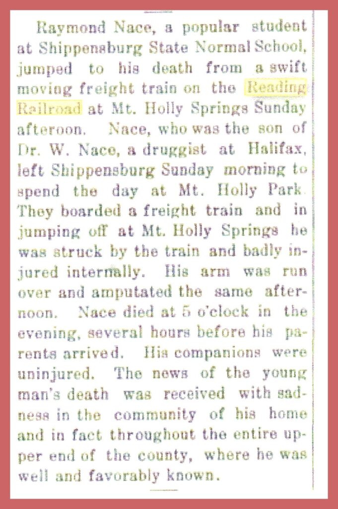 Raymond Nace, a popular student at Shippensburg State Normal School, jumped to his death from a swift moving freight train on the Reading Railroad at Mt. Holly Springs Sunday afternoon. Nace, who was the son of Dr. W. Nace, a druggist at Halifax, left Shippensburg Sunday morning to spend the day at Mt. Holly Park. They boarded a freight train and in jumping off at Mt. Holly Springs he was struck by the train and badly injured internally. His arm was run over and amputated the same afternoon. Nace died at 5 o’clock in the evening, several hours before his parents arrived. His companions were uninjured. The news of the young man’s death was received with sadness in the community of his home and in fact throughout the entire upper end of the county, where he was well and favorably known.