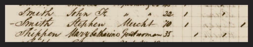 The 1863 Philadelphia City Census gives the 70-year old Smith’s occupation as “merchant”. The mark in the last column indicates that he was “colored.”