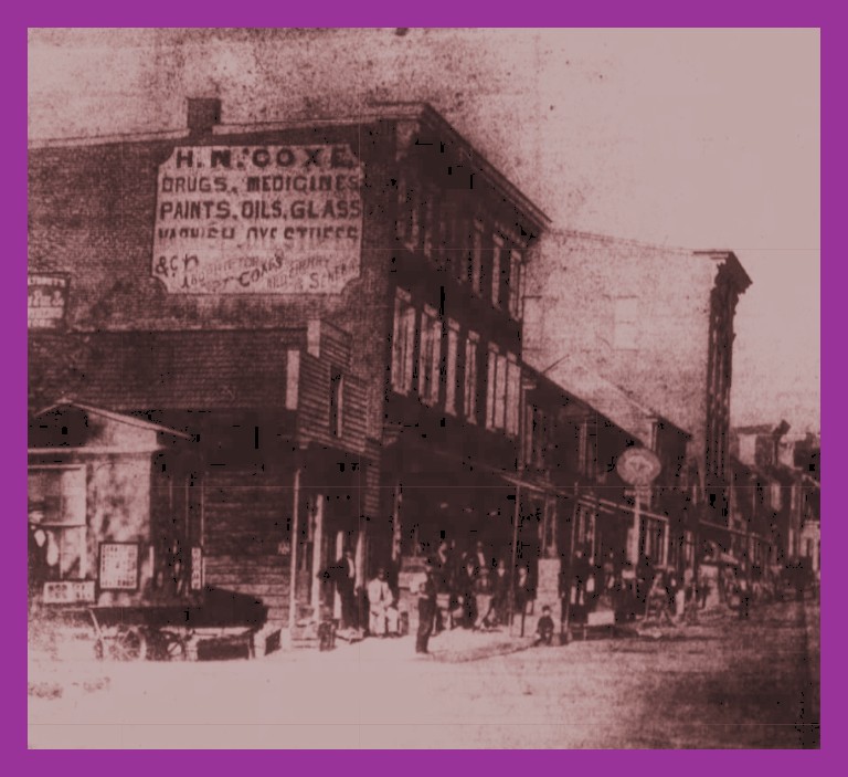 Between 1870 and 1875 this interesting picture was taken of the north side of Main Street, looking eastward from St. John Street to Dock Street. The area has always been filled with business goings-on.
