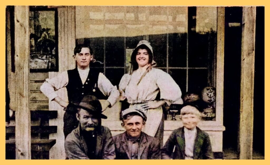 A photograph taken in 1915 (recently colorized) of the Levi Miller General Store, Suedberg, Schuylkill County, Pennsylvania.
