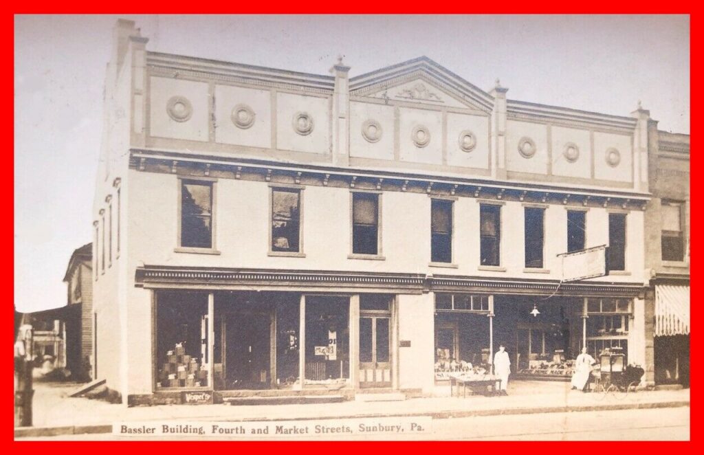 An undated photo post card view of the Bassler Building, Fourth and Market Streets, Sunbury, Northumberland County, Pennsylvania.