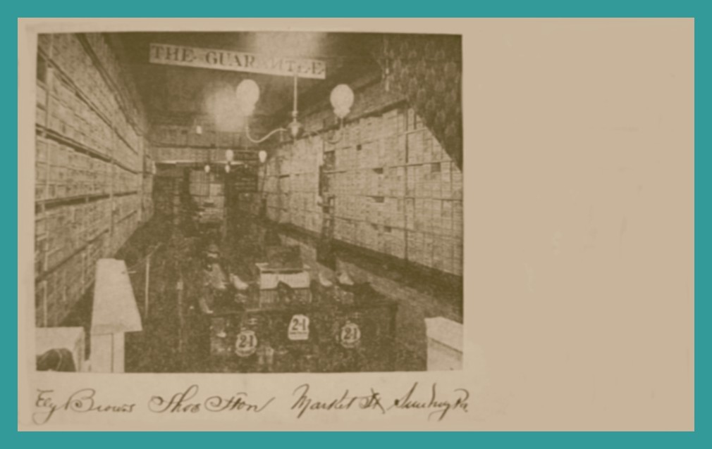 An undated advertising post card for the Ely Brower Shoe Store, Market Street, Sunbury, Northumberland County, Pennsylvania.