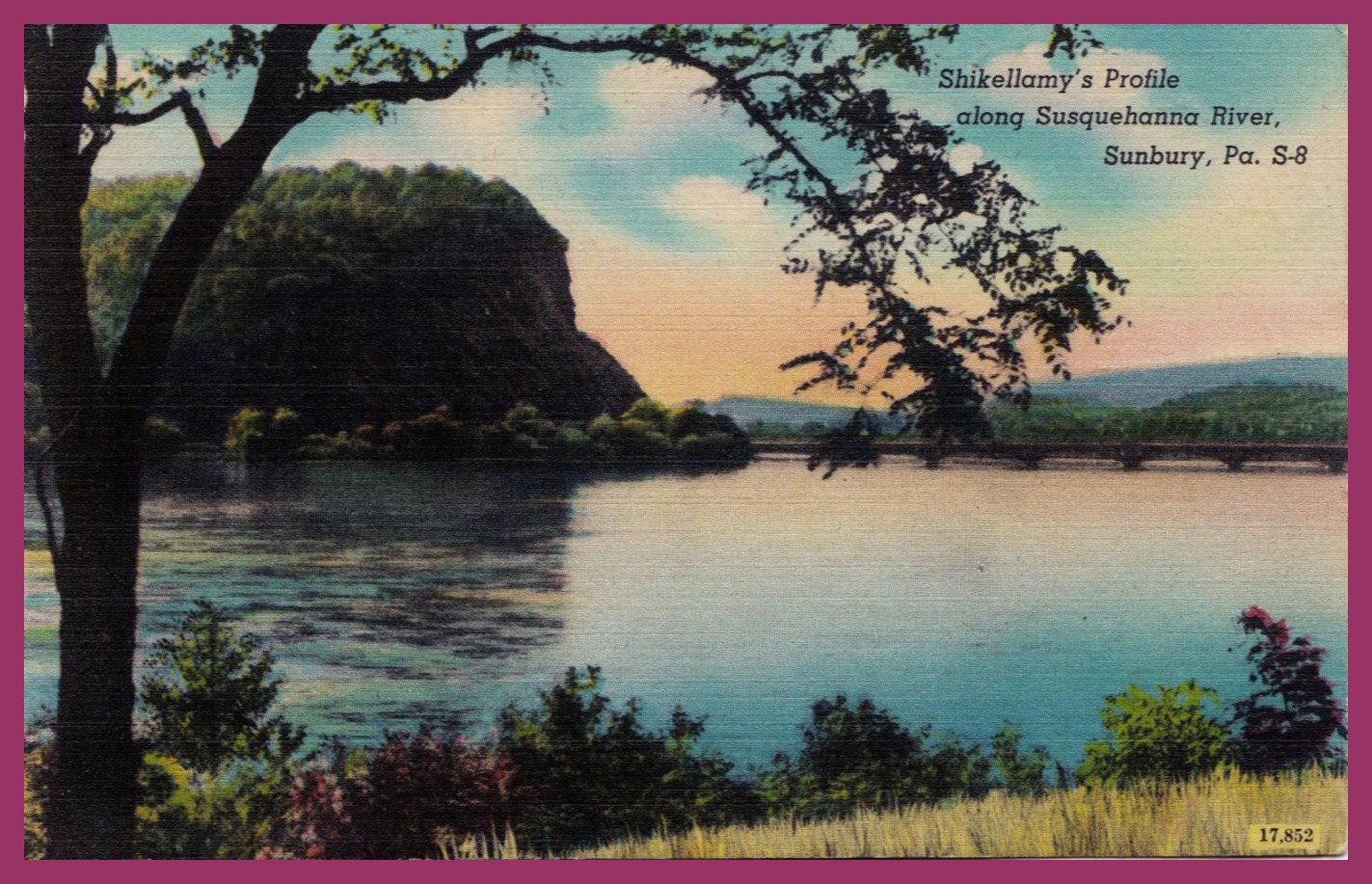 An undated colorized photo post card view of the Shikellamy profile along the Susquehanna River near Sunbury, Northumberland County, Pennsylvania.
