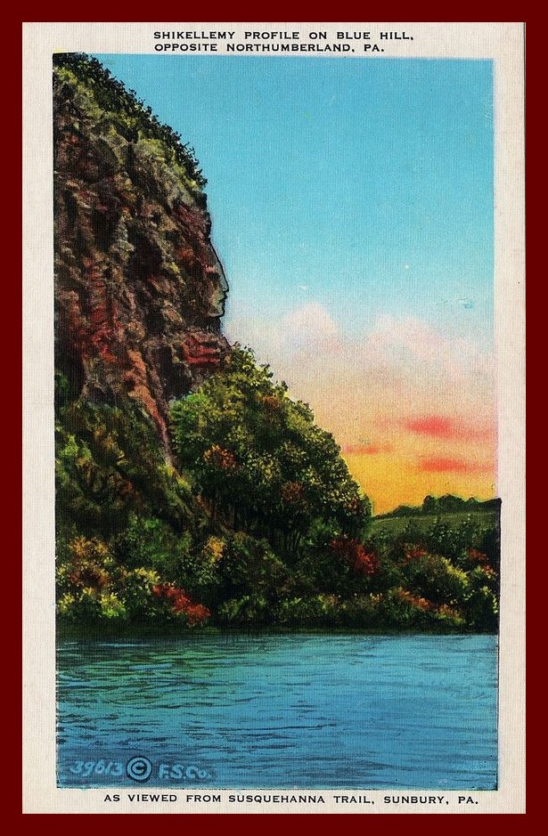 An undated colorized photo post card view of the Shikellamy profile at Blue Hill, near Sunbury, Northumberland County, Pennsylvania and opposite Northumberland, Northumberland County.