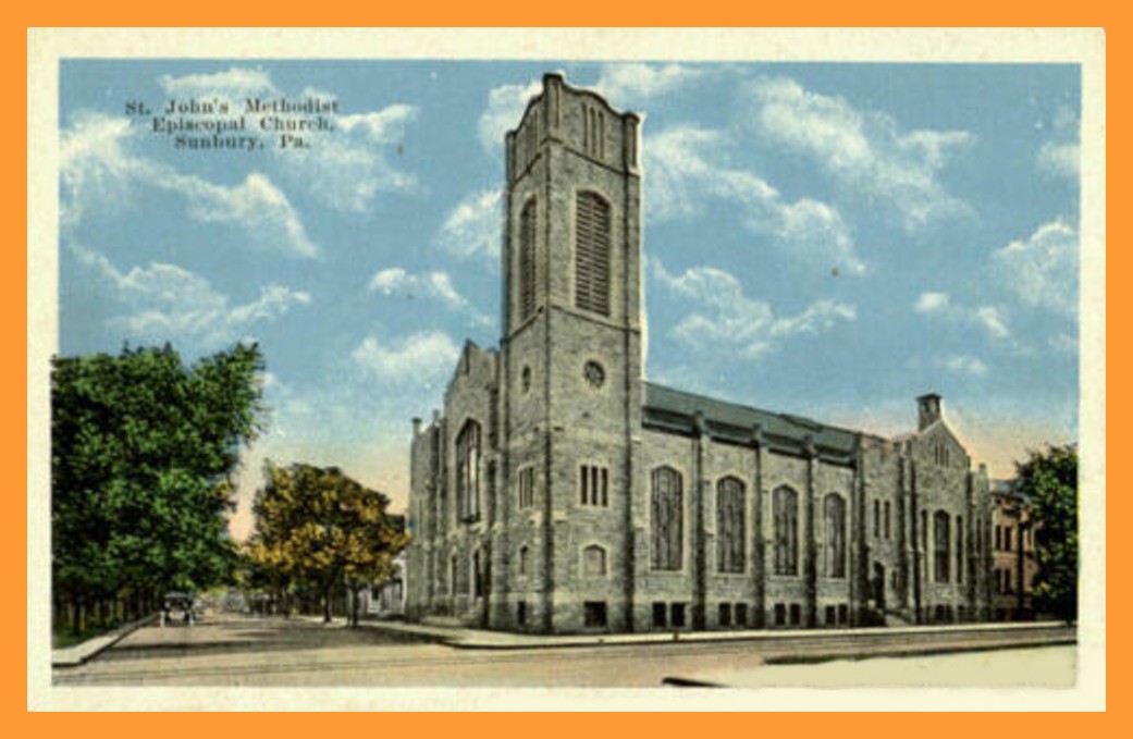 An undated colorized post card view of St. John’s Methodist Episcopal Church, Sunbury, Northumberland County, Pennsylvania.