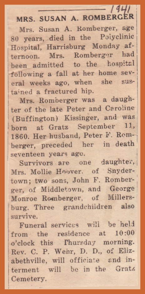 Mrs. Romberger was a daughter of the late Peter Kissinger and Caroline [Buffington] Kissinger, and was born at Gratz, 11 September 1860. Her husband, Peter F. Romberger, preceded her in death seventeen years ago.