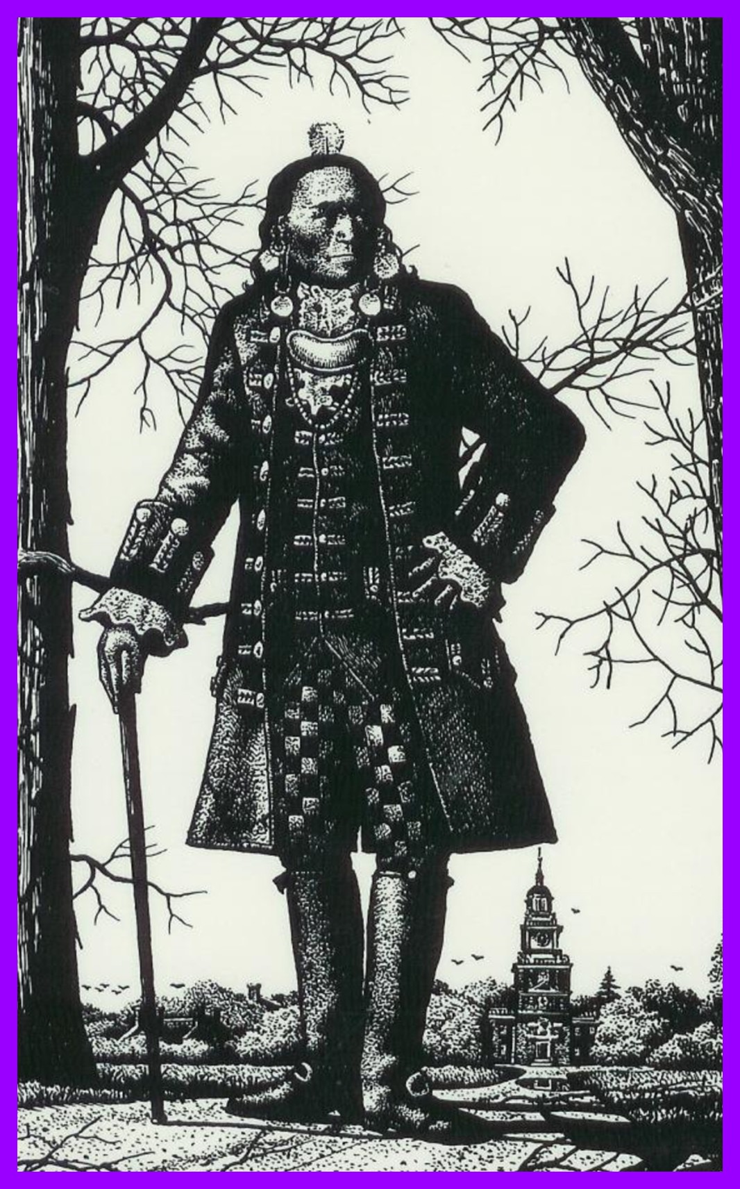 Image, which is in the public domain, is also posted on Wikipedia. Engraving depicts Teedyuscung in Philadelphia, with Independence Hall in background.
