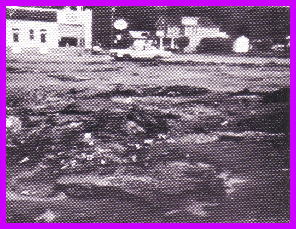 A June 1972 photograph of the parking lot between the Shop ‘n Play and Malick’s Esso Service Station, Lykens, Dauphin County, Pennsylvania, showing damage done by the flood.