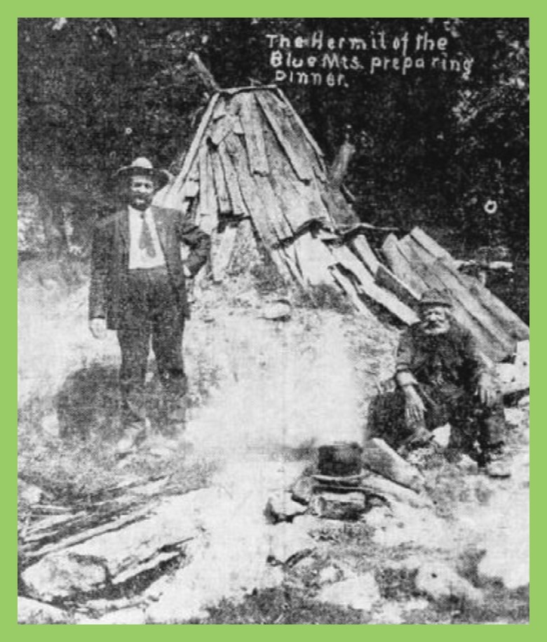 A photograph taken around 1910 of the “Hermit of the Blue Mountains,” Benjamin Loeb, preparing his dinner. The visitor, at left, is Levi Ritzman, a storekeeper in Strausstown, Berks County, Pennsylvania.