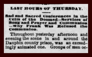 He stated that he did not think the Lord’s Supper would be administered at all, as he and his fellow ministers were not satisfied with Frank’s spiritual frame of mind.  At 1:35 the door of cell No. 25 was closed for the night, the last upon this earth for the occupant.  From this hour a death-like silence prevailed and no sign of life appeared to be about the establishment save the night watchman, old John Cline.