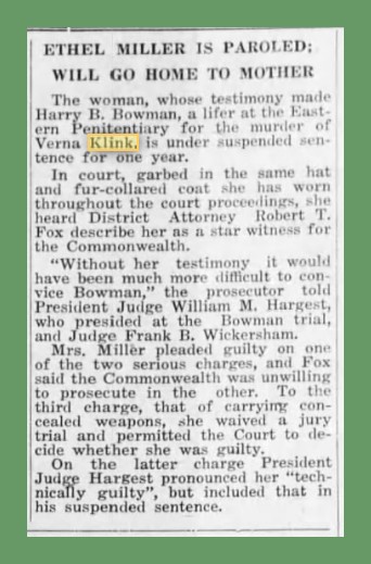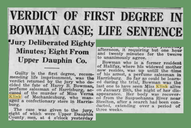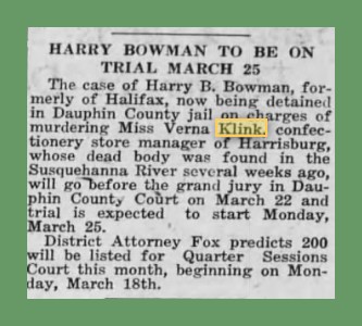 In February 1929, Harry Benton Bowman, formerly of Halifax, Dauphin County, Pennsylvania, was formally charged with the murder of Verna Klink, a Harrisburg confectionery store manager. Bowman first stole $900 from Klink, beat her up, and then threw her body in the Susquehanna River. The trial took place in March 1929 and Bowman was convicted and sentenced to life in prison at Eastern State Penitentiary in Philadelphia. He died there, January 5, 1954.