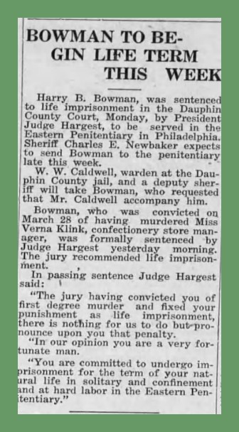 Harry B. Bowman, was sentenced to life imprisonment in the Dauphin County Court, Monday, by President Judge Hargest, to be served in the Eastern Penitentiary in Philadelphia.  Sheriff Charles E. Newbaker expects to send Bowman to the penitentiary late this week.