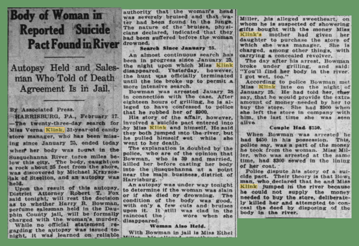 At an inquest held concurrently with the hearing, a coroner’s jury found that Miss Klink “came to her death in Susquehanna River by drowning following blows inflicted on her face and head by one Harry B. Bowman, alias Hon,” formerly of Halifax.