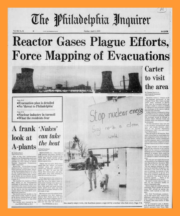 The front page from the Philadelphia Inquirer of 40 years ago today describing events related to the partial melt down of the nuclear power plant at Three Mile Island.