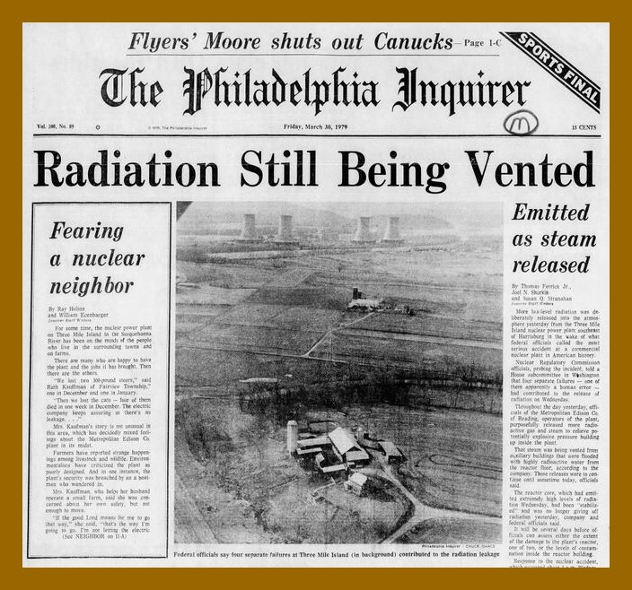 The front page from the Philadelphia Inquirer of 40 years ago today describing events related to the partial melt down of the nuclear power plant at Three Mile Island.