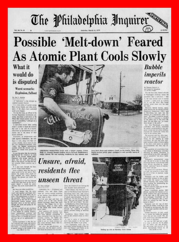 The front page from the Philadelphia Inquirer of 40 years ago today describing events related to the partial melt down of the nuclear power plant at Three Mile Island.