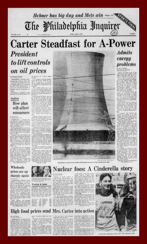 The front page from the Philadelphia Inquirer of 40 years ago today describing events related to the partial melt down of the nuclear power plant at Three Mile Island.