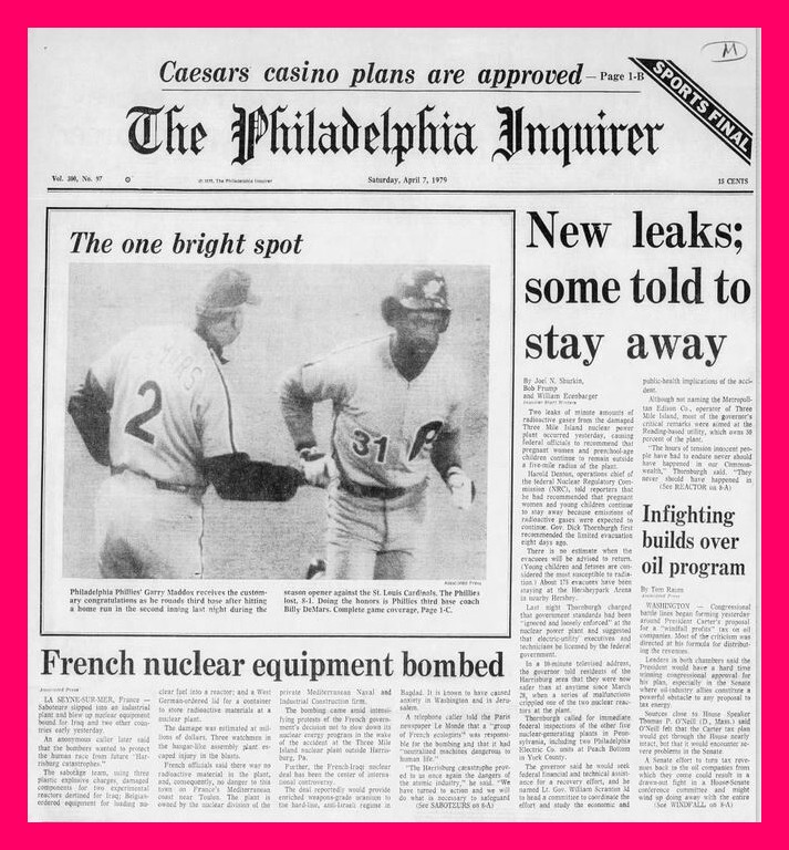 The front page from the Philadelphia Inquirer of 40 years ago today describing events related to the partial melt down of the nuclear power plant at Three Mile Island.