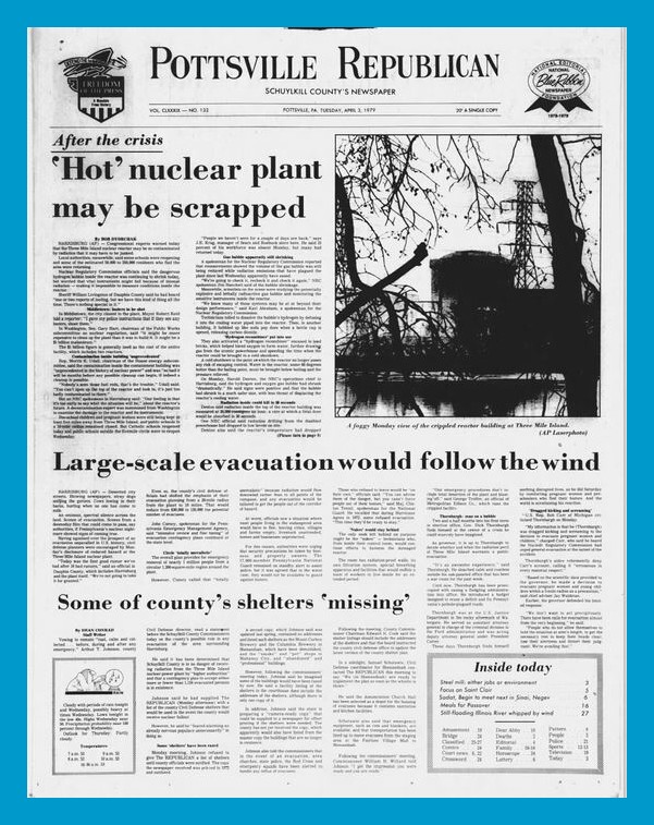 The front page from the Pottsville Republican of 40 years ago today describing events related to the partial melt down of the nuclear power plant at Three Mile Island.