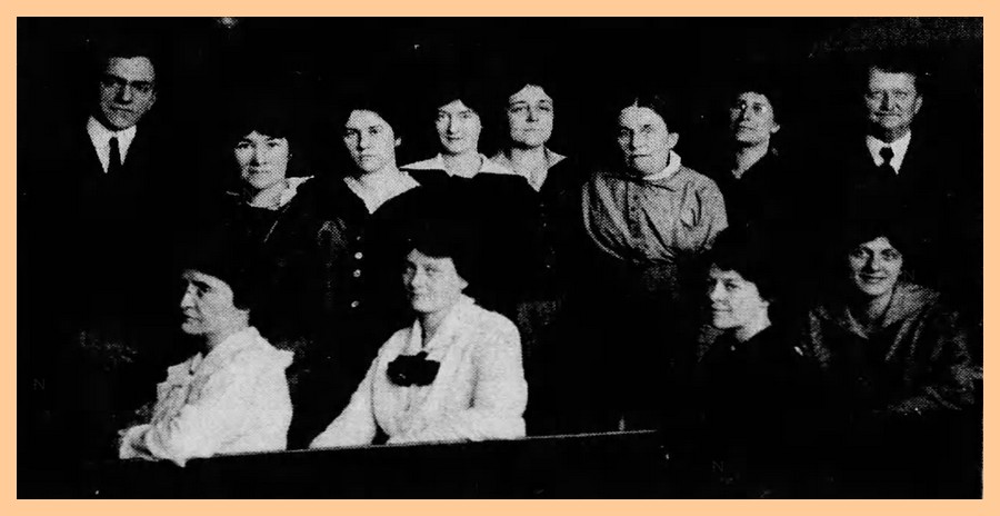 Back Row (standing): Mr. Kiehl; Emma Lawler; Winifred Evans; Margaret Walsh; Margaret Boyer, principal; Fannie Moore; Laura Beider; C. C. Kehler.