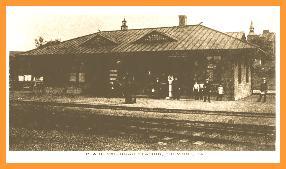 A newspaper photograph of an old undated post card view of the Philadelphia and Reading Railroad Station at Tremont, Schuylkill County, Pennsylvania. The people on the platform are not identified.