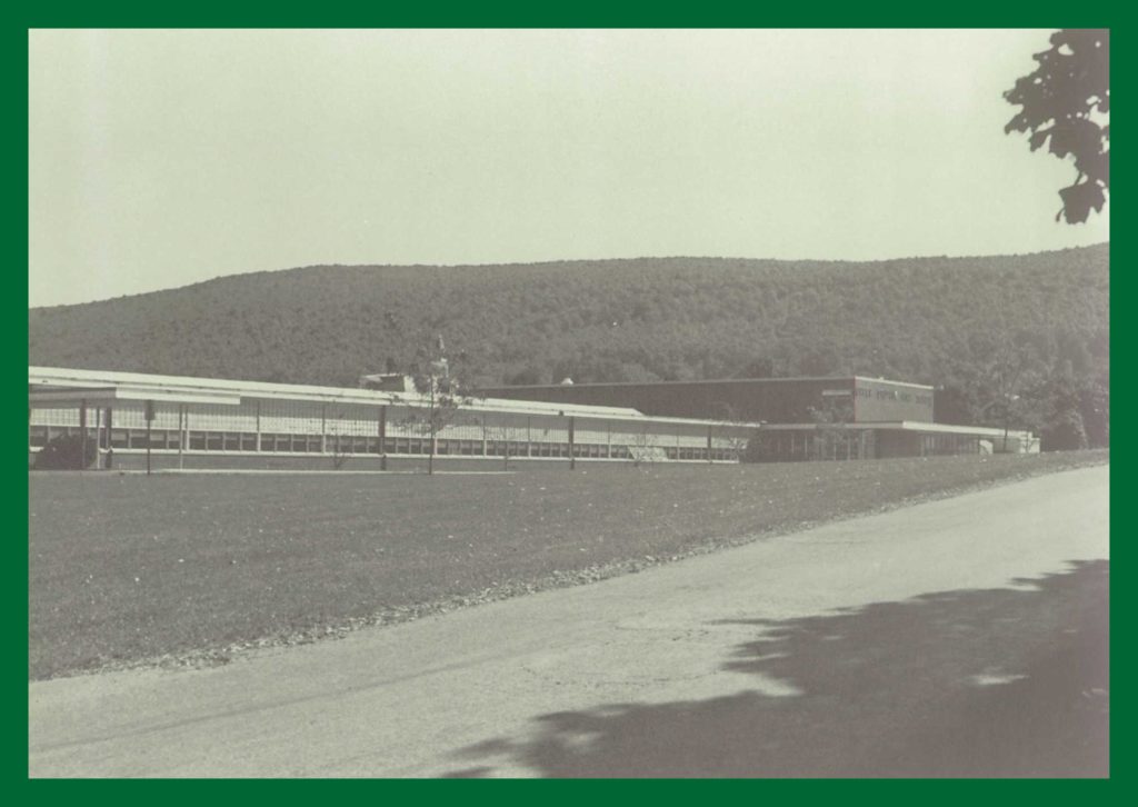 A 1976 photograph of the Upper Dauphin Area High School, Elizabethville, Dauphin County, Pennsylvania. The view is looking southeast and Berry Mountain is in the background.