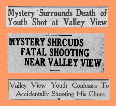 A mysterious death occurred in Valley View, Schuylkill County, Pennsylvania, in October 1925. Two boys, Harry Etzweiler and Norman Bixler, went looking for a dog and one of them, Bixler, ended up dying from a gunshot wound. The original verdict was that Bixler had accidentally shot himself in the breast. Conflicting information given by Etzweiler led to further investigation resulting in a confession that the surviving boy was the one who pulled the trigger, and that the gunshot was accidental. Additional research in newspapers of the time found that the “accidental firing” statement was the one that was finally accepted by the authorities.