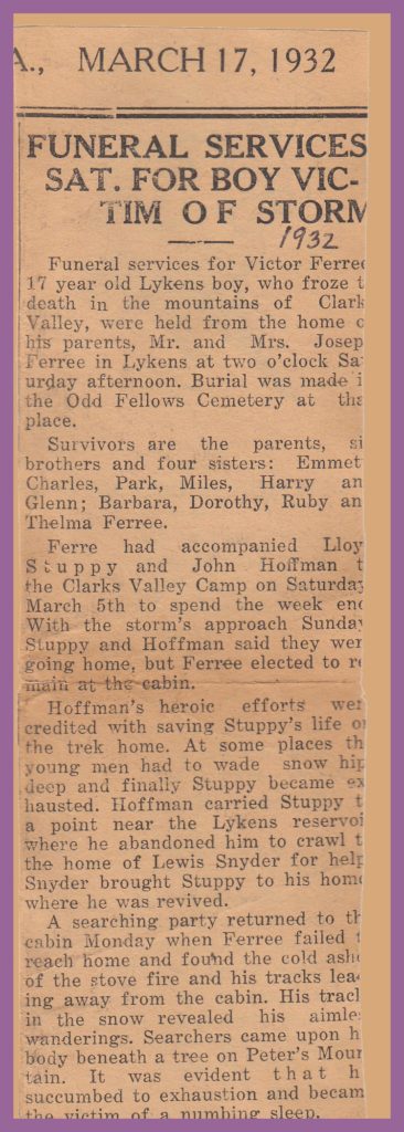 Funeral services for Victor Ferree, 17 year -old Lykens boy, who froze to death in the mountains of Clarks Valley, were held from the home of the parents, Mr. and Mrs. Joseph Ferree in Lykens at two o’clock Saturday afternoon. Burial was made in the Odd Fellows Cemetery at that place.