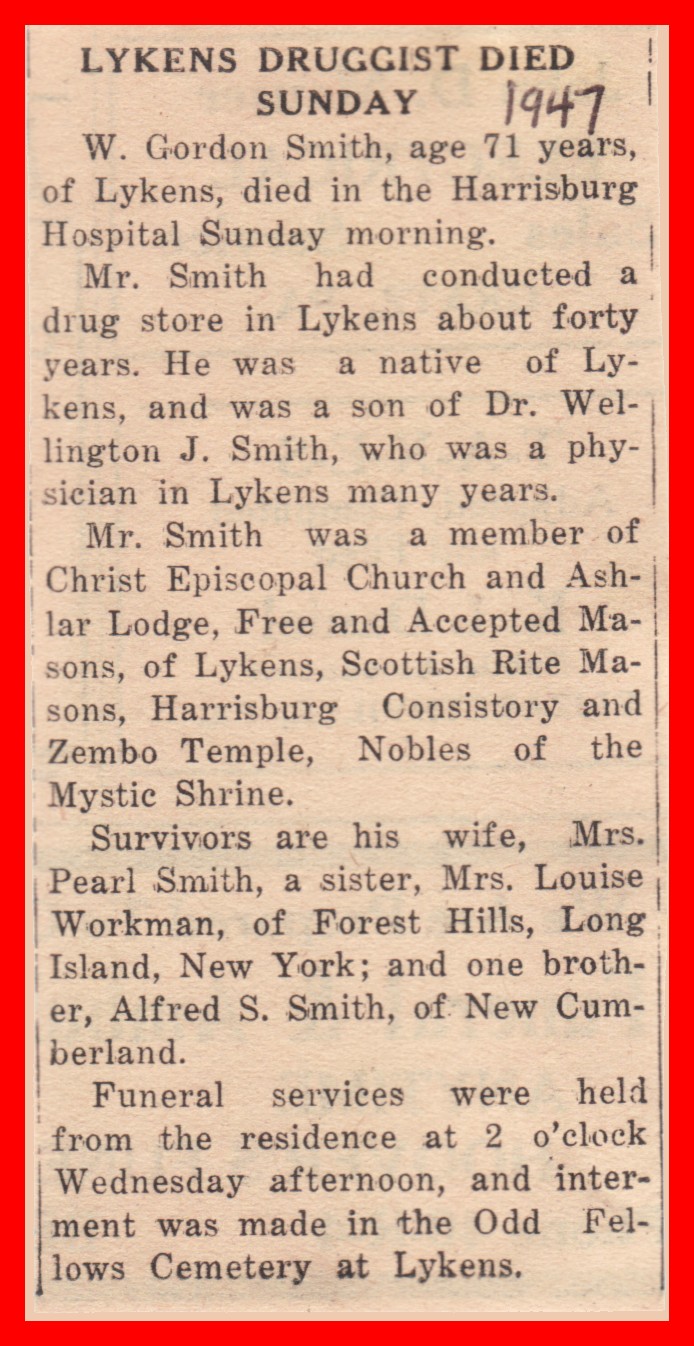Mr. Smith had conducted a drug store in Lykens about forty years. He was a native of Lykens, and was a son of Dr. Wellington J. Smith, who was a physician in Lykens many years.