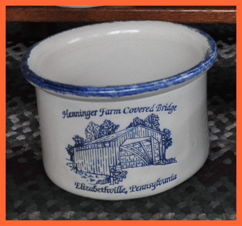 A souvenir crock depicting the Henninger Farm Covered Bridge, Washington Township, outside Elizabethville, Dauphin County, Pennsylvania.