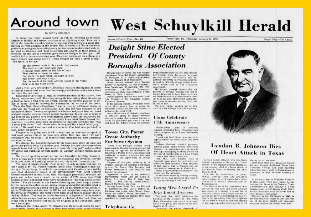 The front page of the West Schuylkill Herald, January 25, 1973, with a portrait of former President Lyndon Baines Johnson, and a brief article announcing his death.