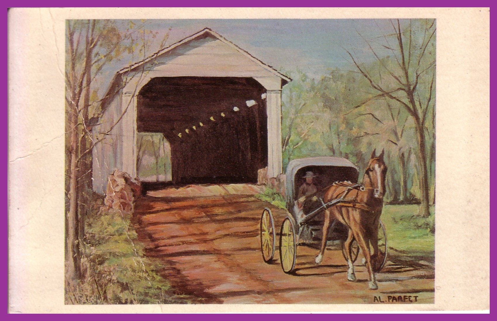 An undated post card view of a painting by Al Parfet showing Dr. Ira Keiter in his buggy passing through a covered bridge on his way to an appointment. The artist identified the the bridge as the “White Bridge,” which was the name of several of the covered bridges in the Lykens Valley area. The location of the original painting is unknown.