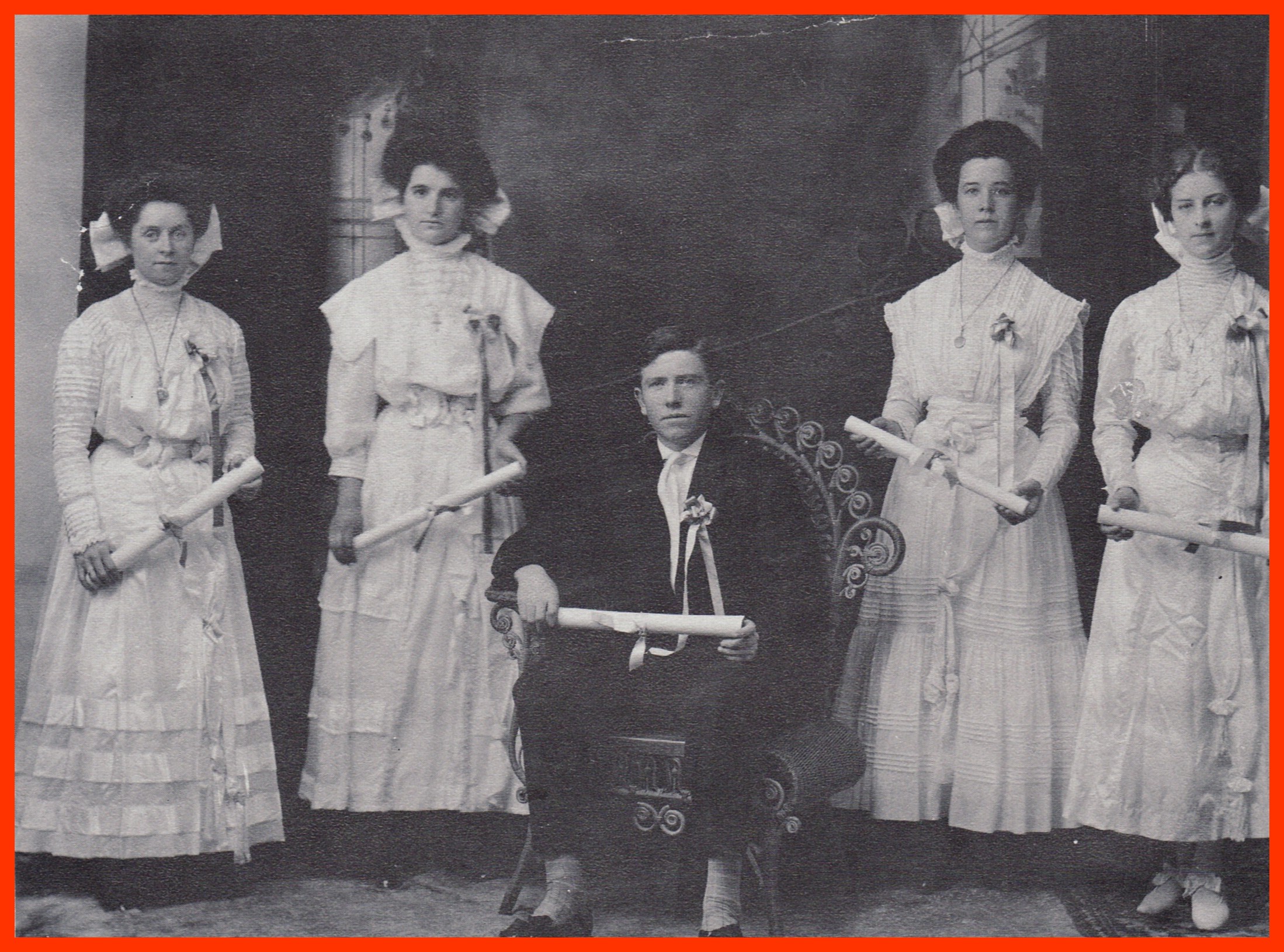 In the photo, the class members appear (left to right): Mary E. Maher; Sadie Punch; Richard Budd, seated; Veronica McAuliffe; Josephine Smink.