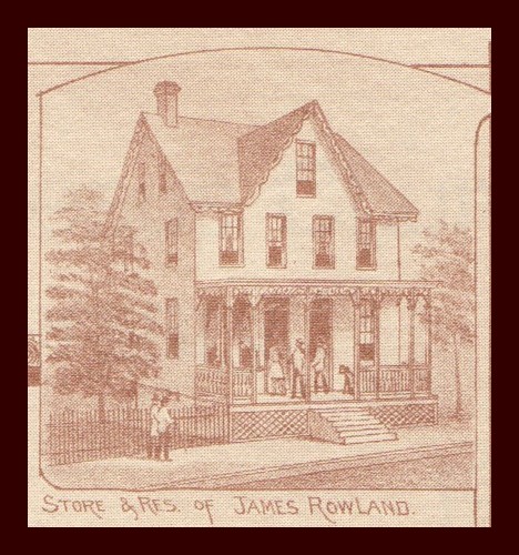 A 1888 view of the residence and store of James Rowland, as presented on a print of a birds-eye view of Williamstown, Dauphin County, Pennsylvania.