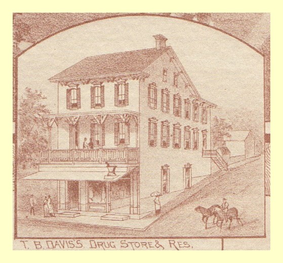 A 1888 view of the residence and drug store of T. B. Davis, as presented on a print of a birds-eye view of Williamstown, Dauphin County, Pennsylvania.