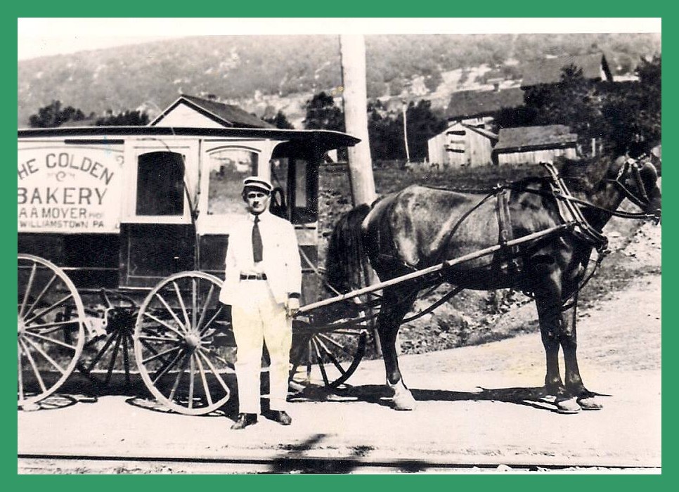 An undated photograph of Art A. Moyer with his horse and bakery wagon for The Golden Bakery, Williamstown, Dauphin County, Pennsylvania. The bakery was owned by Art Moyer and Eva Moyer.