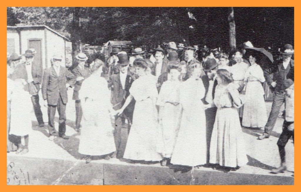 A 1907 photograph entitled “Waiting for the Trolley in Williamstown,” Dauphin County, Pennsylvania. The individuals, none of whom are identified, are returning home from a Sacred Heart Church picnic.