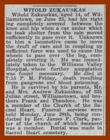 Witold Zukauskas, aged 14, of Williamstown, on June 25, had his right leg completely severed between the knee and hip when a car under which he took shelter from the rain moved sufficiently to pass over it. Unknown to him a locomotive came to move the draft of cars and in coupling up sufficient force was used to cause the wheels to pass over the leg, completely severing it. He was immediately taken to the Williams Valley Hospital, where further amputation was found necessary. He died at 7:15 P.M. Friday, death resulting from gangrene and blood poisoning.