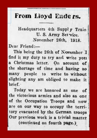 A World War I letter from Lloyd “Skip” Enders dated 26 November 1918 was printed in the Elizabethville Echo, 26 December 1918: