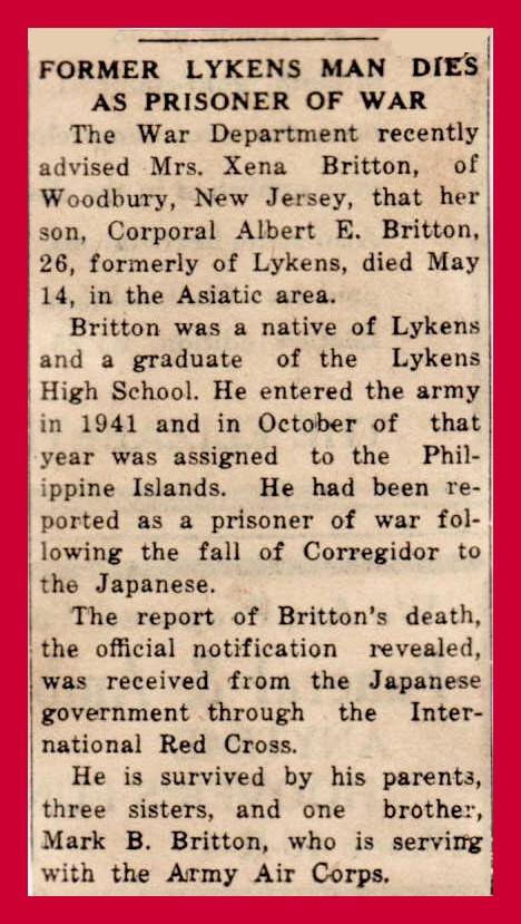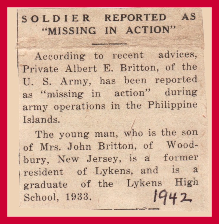 Britton was a native of Lykens and a graduate of the Lykens High School. He entered the army in 1941 and in October of that year was assigned to the Philippine Islands. He had been reported as a prisoner of war following the fall of Corregidor to the Japanese.